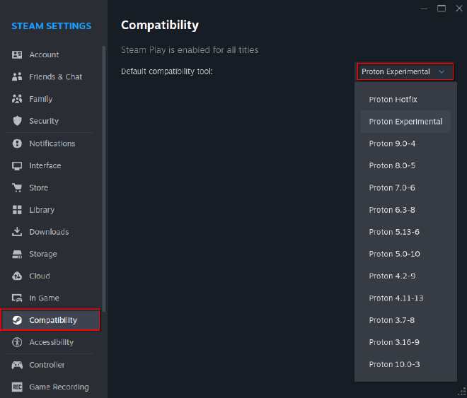 Il est possible de sélectionner différentes versions de Proton. Suivant les jeux que vous voulez jouer, il est possible qu’une version proton soit plus adaptée pour votre jeu. Mais par principe, la dernière version Proton est la plus performante. si vous avez un doute, vérifiez ProtonDB.